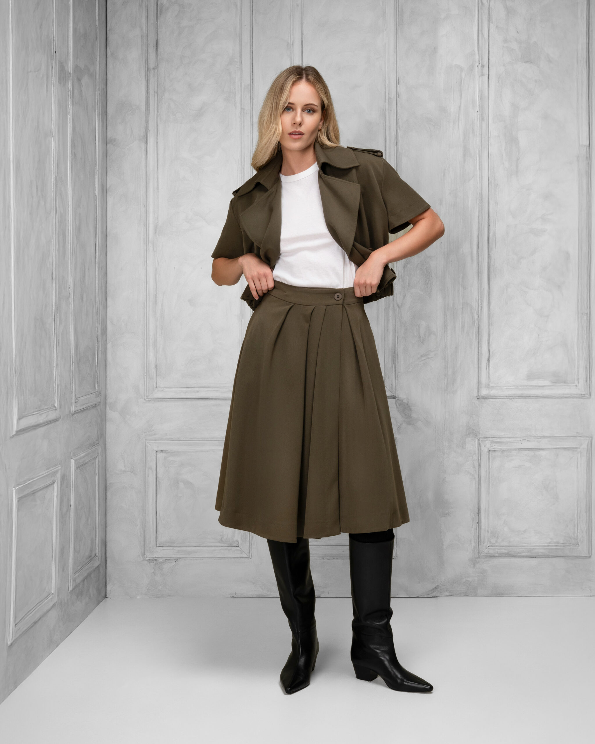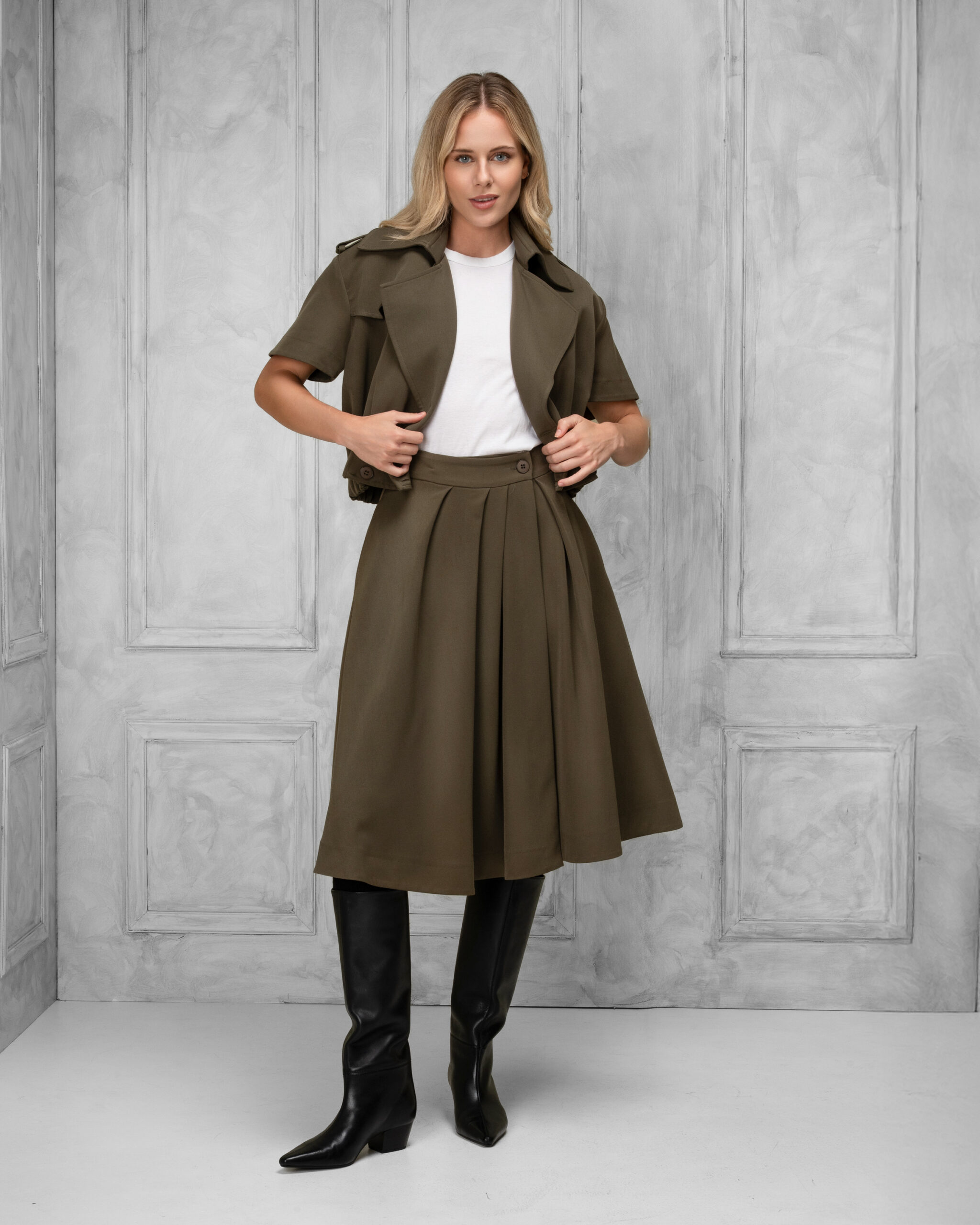 The haki flair skirt, 62%pol-32%vis-6%el, adjustable waist, with buttons, true size